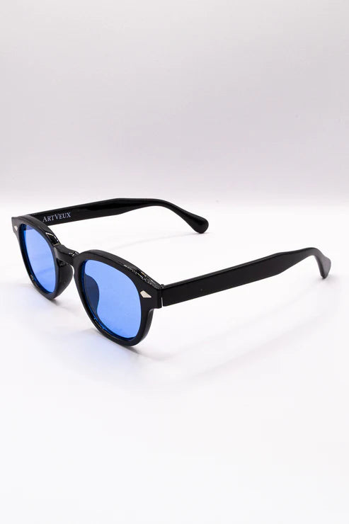 - Bold Contrast – Black frames with vibrant blue lenses.
